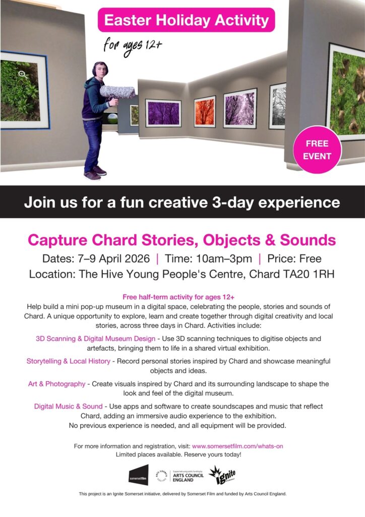 Capture Chard is running from Tuesday 7 to Thursday 9 April, 10am–3pm at The Hive in Chard. This experience offers participants the chance to help build a unique pop-up museum in a digital space. This hands-on project will celebrate the people, heritage, and atmosphere of Chard through a blend of art, technology, and storytelling.