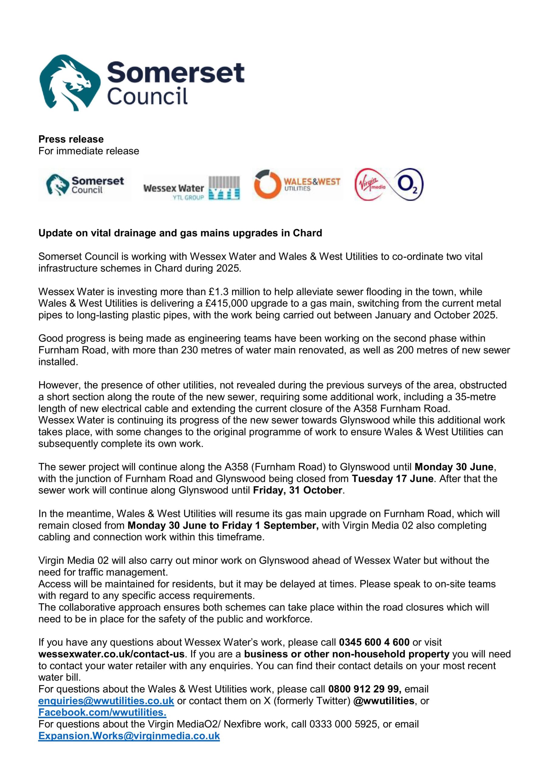 Update from Wessex Water on Sewer and Gas Pipe upgrades Furnham Road Chard